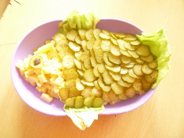 Салатата се прави като картофите се намачкват като за пюре, прибавя се праза, нарязан на ситно и подправките, по избор и хубаво се омесва. В подходяща чиния или плато се разпределя салата, отгоре се нареждат тънките лентички кисели краставички, така че да приличат на люспи на риба. От марулята се правят перките на рибата.Окото на рибата се прави се прави от кръгче прясна краставица, издълбана и вътре сложено парченце червена чушка.